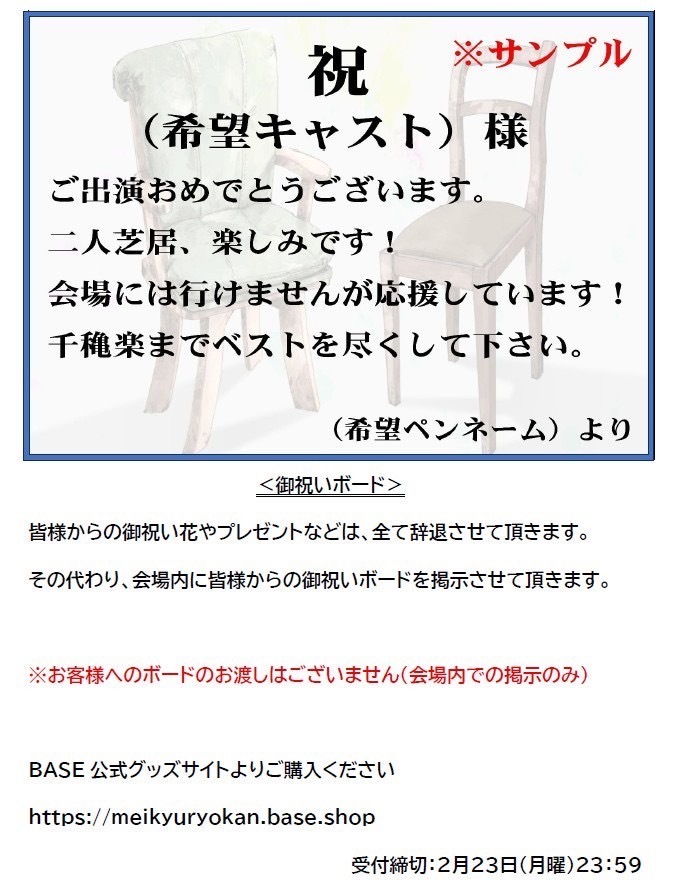 伊藤千由李が出演する二人芝居『ふたりよがり』では、『お祝い花』の代わりに『お祝いボード』を受け付けております!